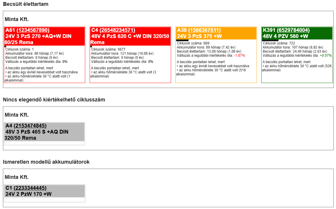 Csak az érvényes szerződéshez tartozó telephelyeken található, PzV vagy PzS akkumulátorok adatai kerülnek kiértékelésre, amiknek már volt ciklusuk. Más modell esetén az "Ismeretlen modellű akkumulátorok" című táblázatban, ciklus nélkül pedig a "Nincs