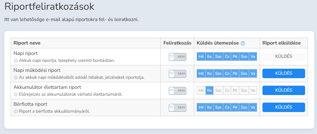 Az ezt követően megjelenő oldalon kissé lentebb görgetve megtalálja a riportok listáját, és van lehetősége feliratkozni rájuk a Feliratkozás oszlopban található kapcsolók segítségével. Itt látható ezen túl a riportok neve és rövid leírása, valamint a küldés ütemezése is. A világoskékkel jelölt napokon kerülnek kiküldésre a levelek (reggel hat óra körül). Ez az ütemezés a felhasználók által nem módosítható, ugyanakkor az utolsó oszlop KÜLDÉS gombjainak segítségével az ütemezéstől függetlenül, tetszőleges időpontban is igényelhetőek bizonyos riportok (ezt kék háttérszínű gomb jelöli).